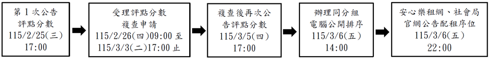 3.複查後評點分數將於115年3月5日(四)17時公告於社會局官方網站及本府安心樂租網;如複查後評點分數與原始分數有差異,以複查分數為最終結果,若該分數有其他同分者,將於115年3月6日(五)14時辦理評點同分組電腦公開排序直播作業(註:請於社會局官網觀看直播)。